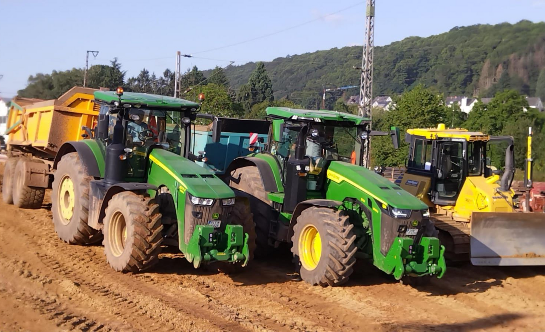 Zuverlässige Transporte von Erdmaterial, Abraum und Schotter erfolgen mit unseren drei leistungsstarken John Deere 8 R Traktoren sowie zwei 2-Achskippmulden und einer Tridem-Kippmulde.